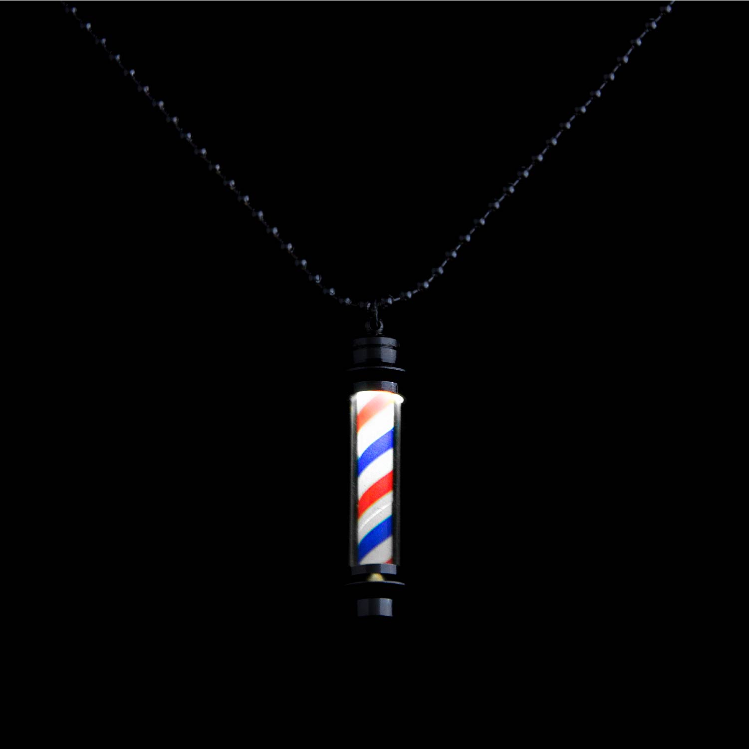 Our barber pole light up necklace is a fun way to advertise your profession! Wear on the 24” ball chain as a casual, mid-chest length necklace, or add it to your keys as a fun memento to show your pride in your career.