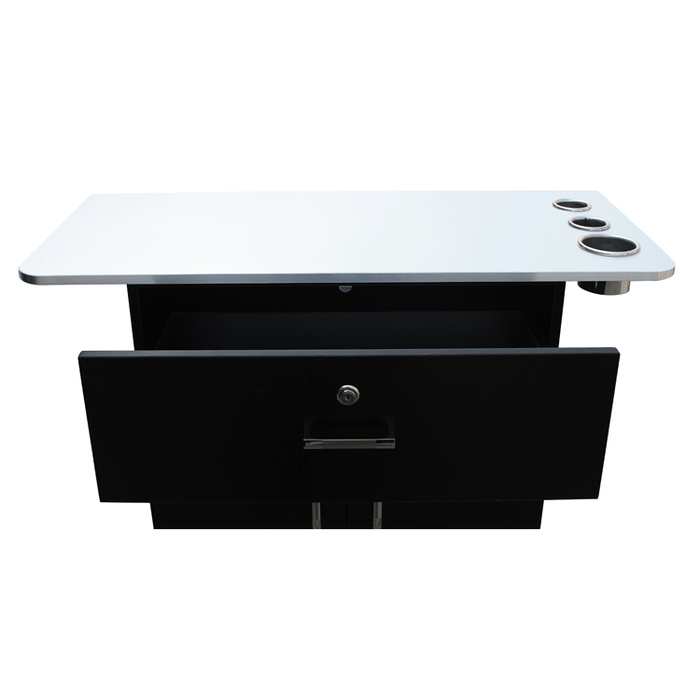 The “Chloe” styling station is great for placement in front of you mirror. The station has a lockable drawer, double door cabinet, and 3 appliance holders. The top has ample workspace for the professional.