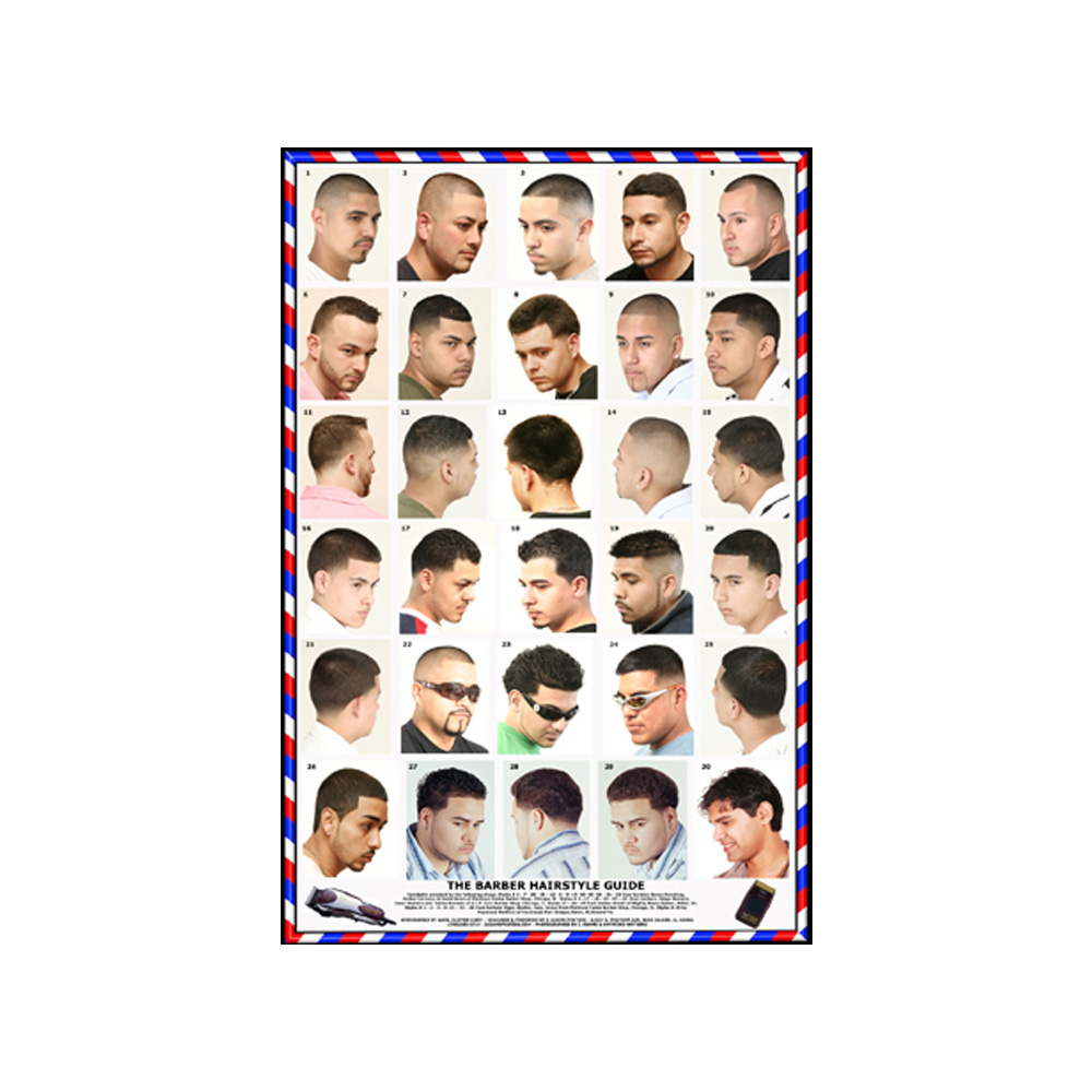 This men’s hairstyle poster for barber shops features 30 different modern haircuts for men, all in their late teens to mid-30s. The poster is 36”L x 24”W. Laminated.